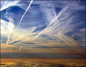 Berichte von chemtrails, ausfiedernde Jet-Kondensstreifen emittiert von Flugzeugen, die stundenlang in der Luft hängen und sich nicht auflösen, oft den Himmel im Zick-Zack-Muster verhängen, haben in den letzten 10 Jahren drastisch zugenommen. Manche spekulieren, dass sie Teil eines Regierungs-Programms seien um das Klima zu ändern, Menschen gegen bestimmte Krankheitserreger zu beimpfen oder Menschen sogar als Teil eines geplanten Bevölkerungs-Reduzierungs-Programms zu vergiften.